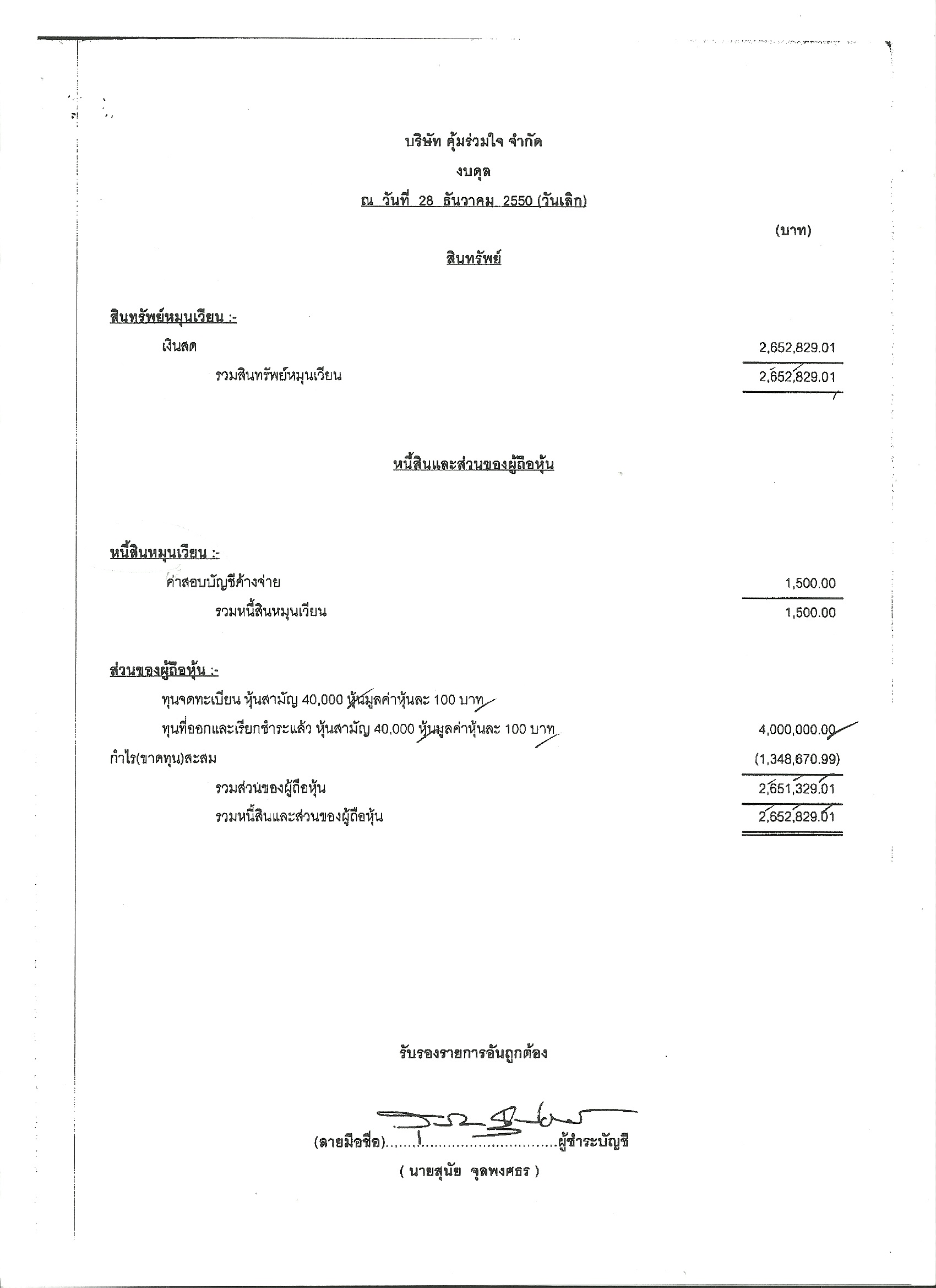 “สุนัย จุลพงศธร” แจ้งป.ป.ช.“เมีย”มีเงินปล่อยกู้บริษัท“ตัวเอง” 7.9 ล้าน ทำสัญญา 1 เม.ย.49 ไม่พบรายการหนี้สินในบัญชีงบดุลบริษัท ก่อนปิดกิจการปี 50