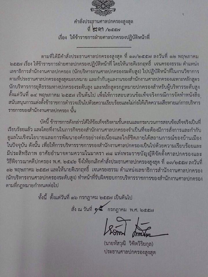 ผู้สื่อข่าวสำนักข่าวอิศรา www.isranews.org ตรวจสอบพบว่า เมื่อวันที่ 15 กรกฎาคม 2557 ที่ผ่านมา นายหัสวุฒิ วิทิตวิริยกุล ประธานศาลปกครองสูงสุด ได้ลงนามในคำสั่งให้ นายดิเรกฤทธิ์ เจนครองธรรม กลับไปดำรงตำแหน่งเลขาธิการสำนักงานศาลปกครองสูงสุดตามเดิม