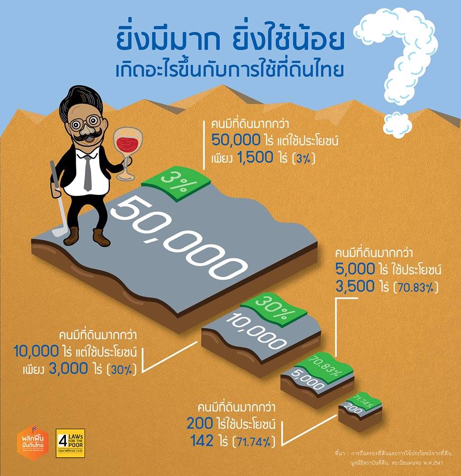 จากข้อมูลจะเห็นว่า "กลุ่มคนที่มีที่ดินมากกว่า 50,000 ไร่ขึ้นไป" แต่กลับใช้ประโยชน์ในที่ดินเพียง 1,500 ไร่ ซึ่งคิดเป็น 3 % จากที่ดินที่ตนเองถือครองเท่านั้น ที่เหลืออีก 97 % หรือ อีกอย่างน้อย 48,500 ไร่ ถูกปล่อยทิ้งไว้โดยไม่มีการทำประโยชน์