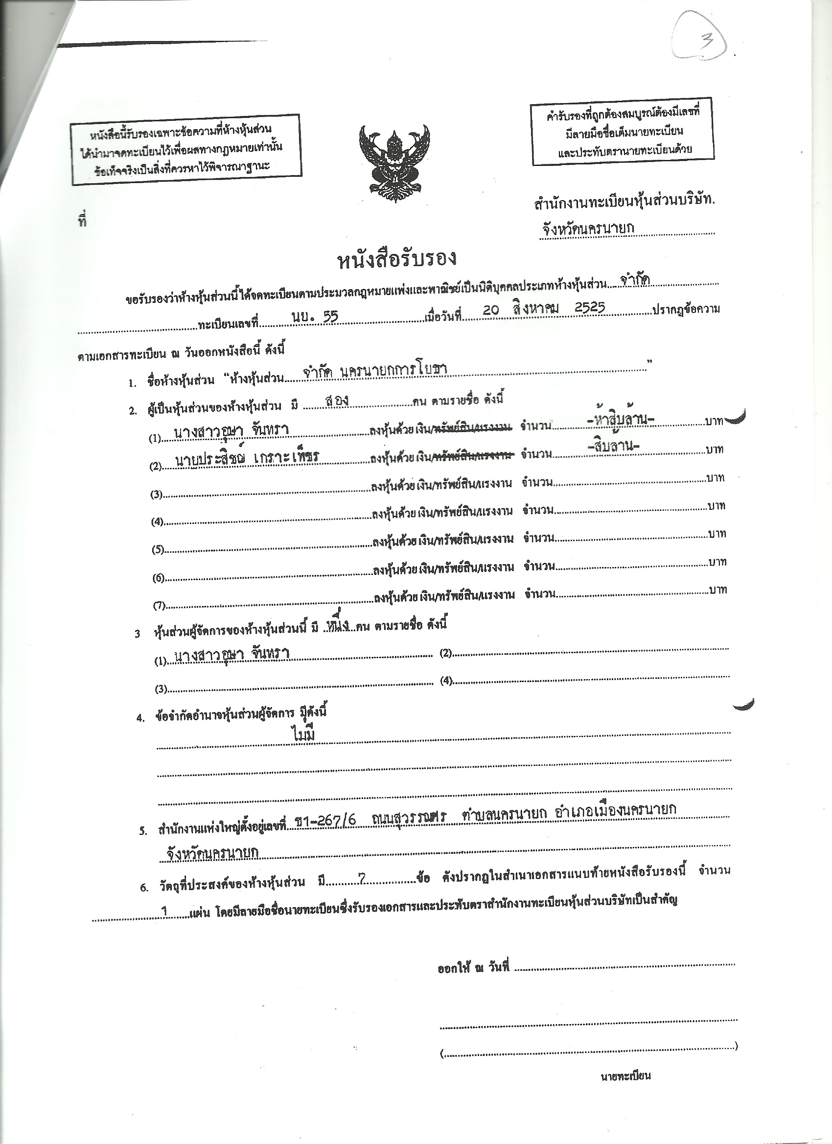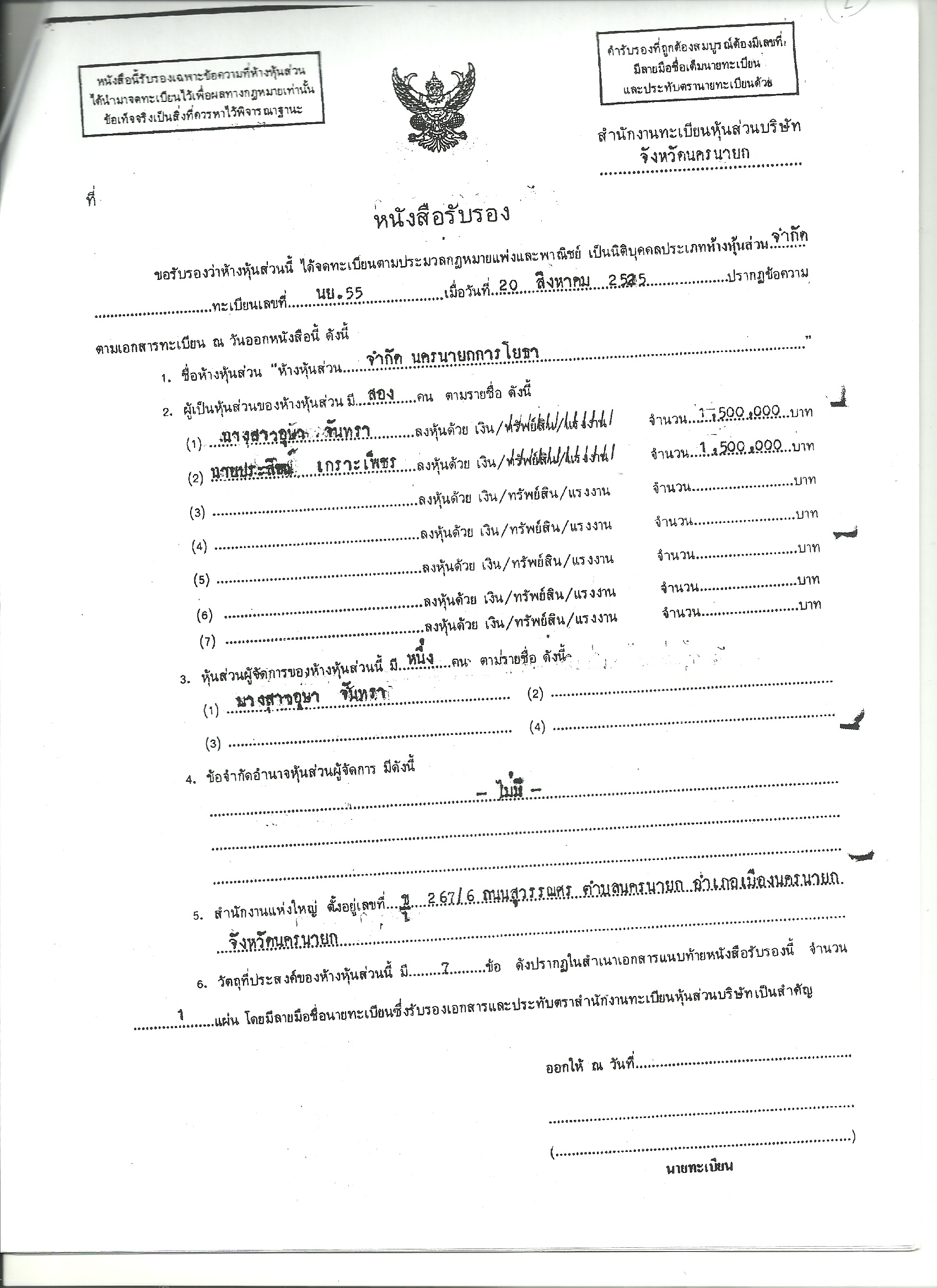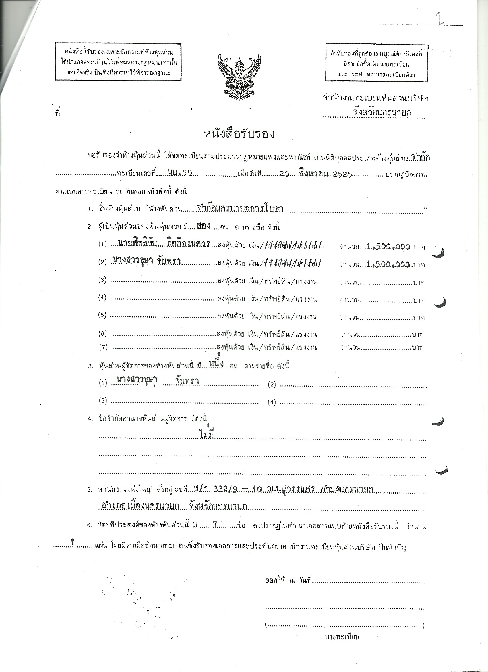 ทั้งนี้ ห้างหุ้นส่วนจำกัด(หจก.) นครนายกการโยธา ปัจจุบันทุนจดทะเบียน60 ล้านบาท มี น.ส.เกยูร โชคล้ำเลิศ ภรรยานายเกรียงไกร กิตติธเนศวร อดีตช่วยงานเลขานุการ นายชัชชาติ สิทธิพันธ์ ถือหุ้นใหญ่ 50 ล้านบาท (รับโอนจาก น.ส.ธัญธารีย์ จารุจิตติวัฒน์) และมีตำแหน่งเป็นหุ้นส่วนผู้จัดการ นายประสิชฌ์ 10 ล้านบาท หจก.แห่งนี้เป็นผู้รับเหมาโครงการหน่วยงานของรัฐในจ.นครนายกตั้งแต่ปี 2543 เป็นต้นมา รวม 70 โครงการ