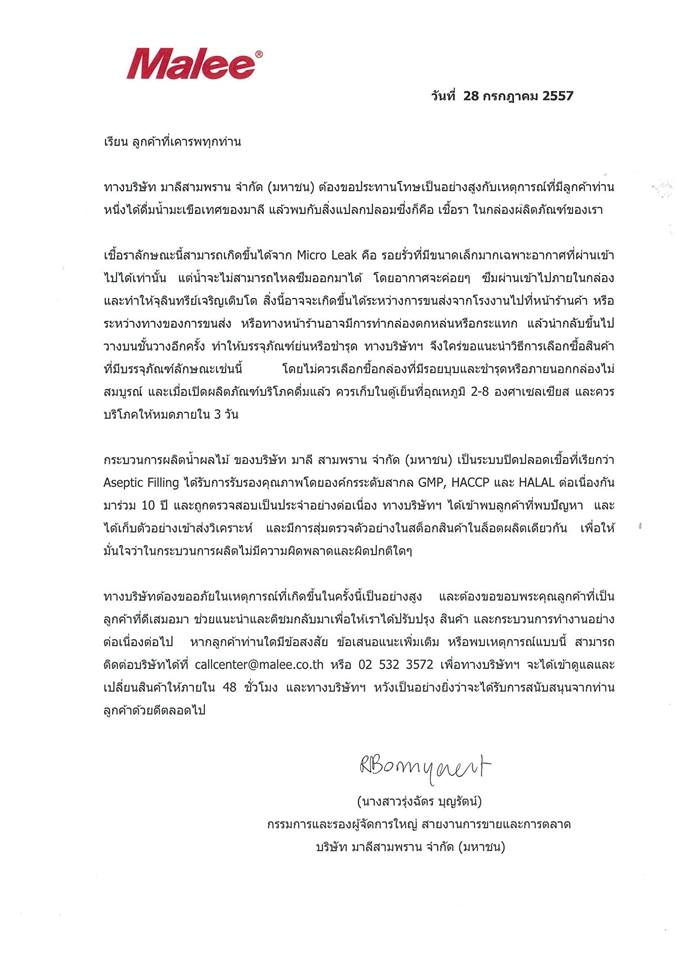 "มาลี" แถลงทางการผลสอบซากปริศนาในกล่องน้ำผลไม้ คือ เชื้อรา ชี้เกิดได้หลายสาเหตุ ออกหนังสือประกาศขออภัยลูกค้าทางการ ด้านรองผจก.ช่อง 7 ลุยยื่นเรื่องมูลนิธิคุ้มครองผู้บริโภคพิสูจน์คู่ขนาน แจงเหตุลบกระทู้pantip ยันไม่ได้รับเงินของกำนัลตอบแทน