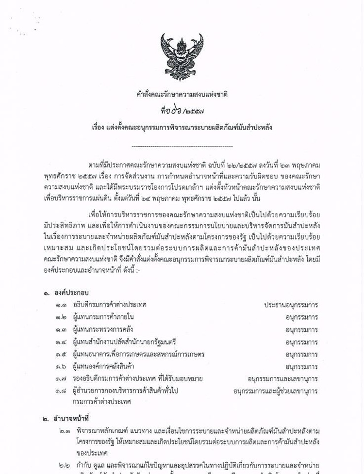 เรื่อง แต่งตั้งคณะอนุกรรมการพิจารณาระบายผลิตภัณฑ์มันสำปะหลัง