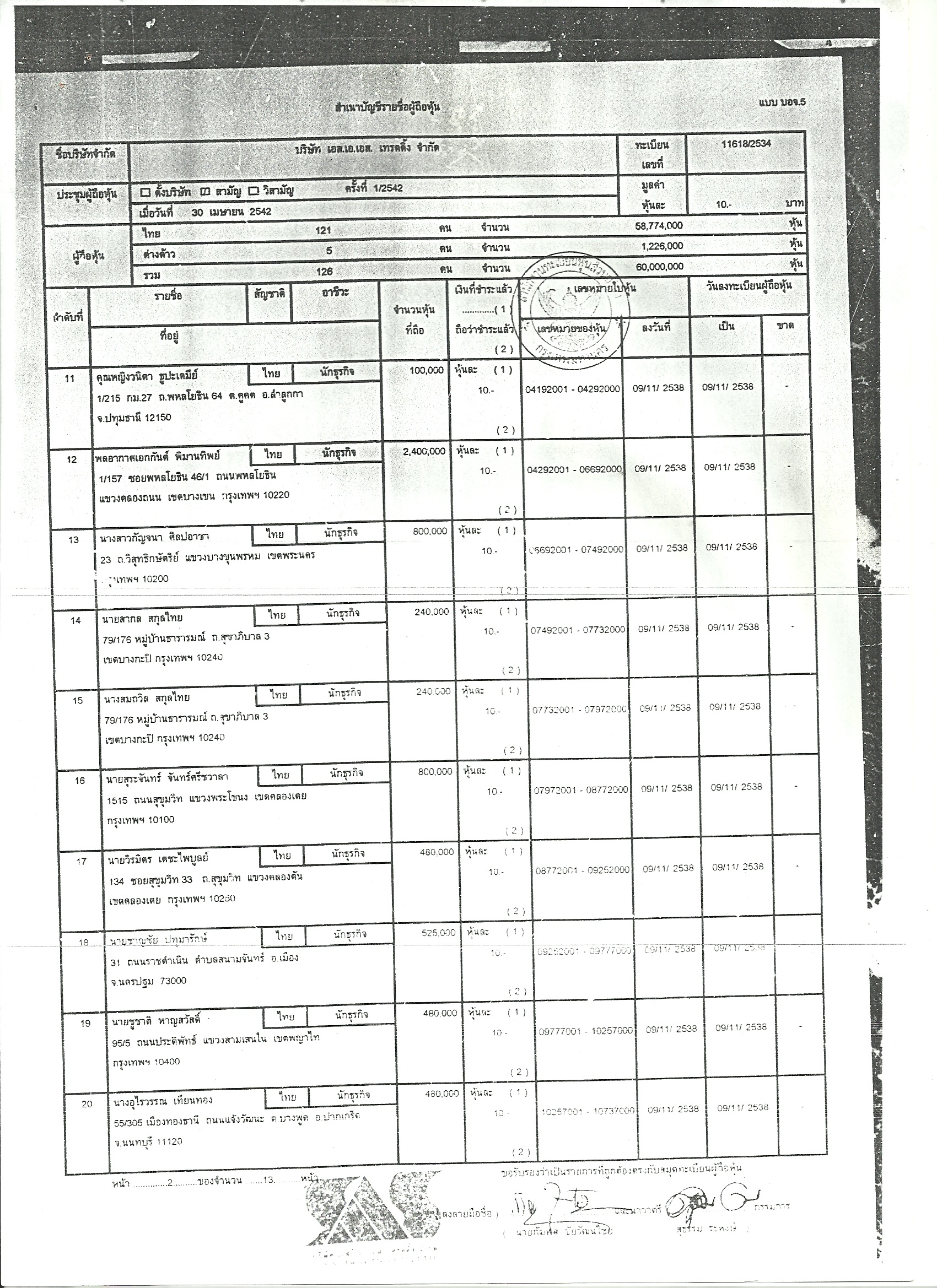 30 เม.ย.2542 มีผู้ถือหุ้นเพิ่มเป็น 126 ราย นายภูษณ ปรีย์มาโนช เข้ามาถือ 1,000,000 หุ้น