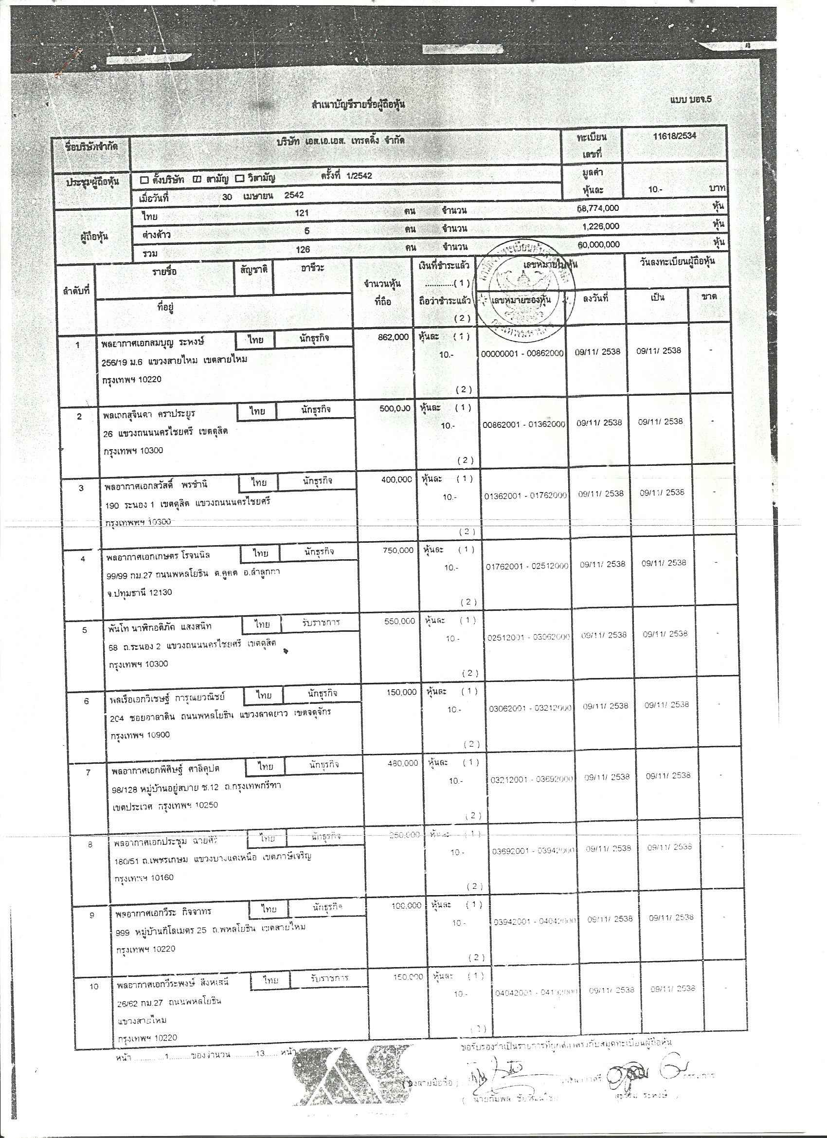 รายชื่อผู้ถือหุ้น บริษัท เอส.เอ.เอส.เทรดดิ้ง จำกัด