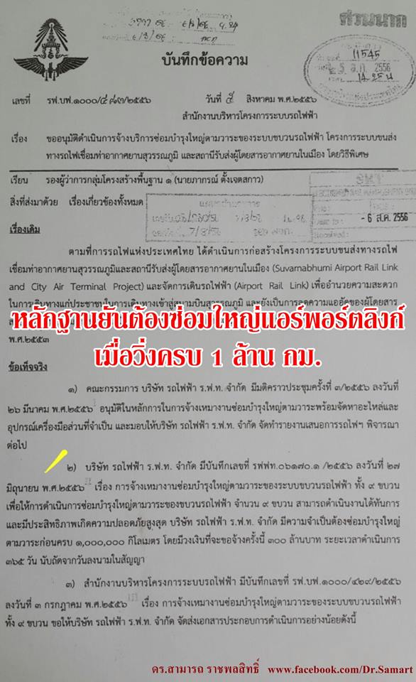 วันที่ 17 ส.ค.57 ผมขอแสดงบันทึกการประชุมของคณะกรรมการ บริษัท รถไฟฟ้า ร.ฟ.ท. จำกัด ครั้งที่ 3/2556วันอังคารที่ 26 มีนาคม พ.ศ. 2556 และหนังสือของ รฟท. เลขที่ รฟ.บฟ. 1000/483/2556 ลงวันที่ 5 สิงหาคม พ.ศ. 2556 ที่ยืนยันว่าจะต้องซ่อมบำรุงใหญ่เมื่อรถไฟฟ้าวิ่งครบ 1 ล้าน กม.
