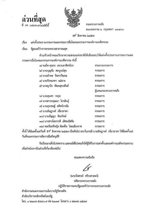 จากกรณีมีการเผยแพร่คำสั่งที่ กค 0806.1/10855 ลงวันที่ 19 สิงหาคม 2557 ถึงรัฐมนตรีว่าการกระทรวงสาธารณสุข เรื่อง แต่งตั้งประธานกรรมการและกรรมการอื่นในคณะกรรมการองค์การเภสัชกรรม แทนชุดเดิมที่ลาออกไป ประกอบด้วย พล.ท.ศุภกร สงวนชาติศรไกร ประธานกรรมการ, นพ.บุญชัย สมบูรณ์สุข, นพ.อำพล จินดาวัฒนะ, นายรักษเกชา แฉ่ฉาย, นางญาใจ พัฒนสุขวสันต์, ภก.สุนทร วรกุล, ศ.ภญ.ดร.กฤษณา ไกรสินธุ์, นพ.สุรเชษฐ์ สถิตนิรามัย, นายอัษฎางค์ เชี่ยวธาดา, ศ.ดร.อัญญา ขันธวิทย์, น.ส.โสภาวดี เลิศมนัสชัย และพล.ร.ต.หญิงพิมพ์ใจ ไชยเมืองราช