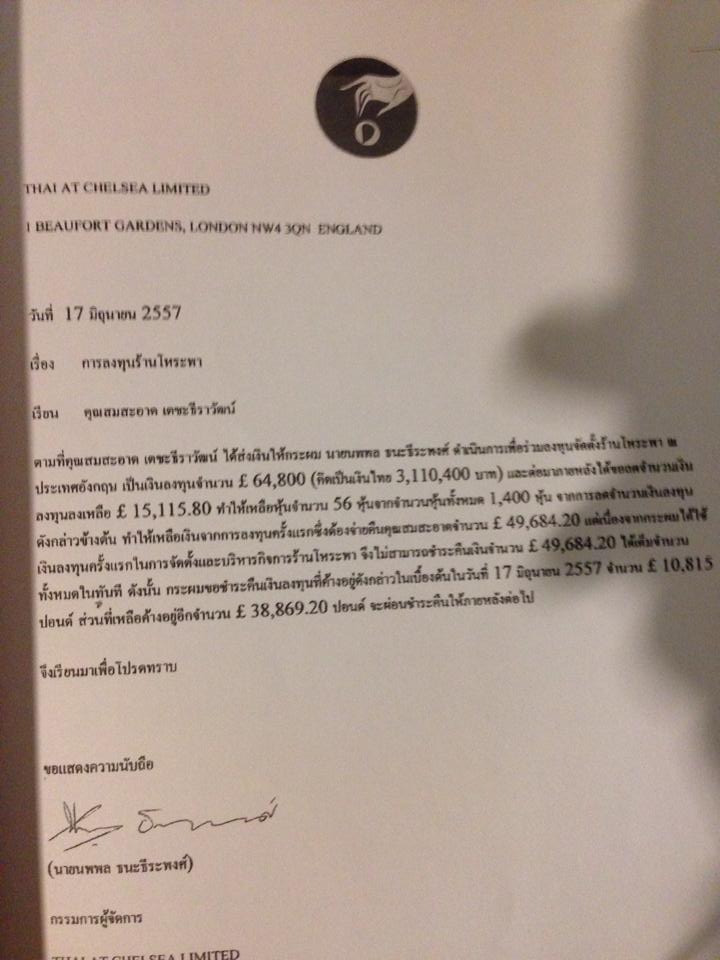 “ตามที่คุณสมสะอาด เตชะธีราวัฒน์ ได้ส่งเงินให้กระผม นายนพพล ธนะธีระพงศ์ ดำเนินการเพื่อร่วมลงทุนจัดตั้งร้านโหระพา ณ ประเทศอังกฤษ เป็นเงินลงทุนจำนวน £64,800 (คิดเป็นเงินไทย 3,110,400 บาท) และต่อมาภายหลังได้ขอลดจำนวนเงินลงทุนลงเหลือ £15,115.80 ทำให้เหลือหุ้นจำนวน 56 หุ้นจากจำนวนหุ้นทั้งหมด 1,400 หุ้น จากการลดจำนวนเงินลงทุนดังกล่าวข้างต้น ทำให้เหลือเงินจากการลงทุนครั้งแรกซึ่งต้องจ่ายคืนคุณสมสะอาด จำนวน £49,684.20 แต่เนื่องจากกระผมได้ใช้เงินลงทุนครั้งแรกในการจัดตั้งและบริหารกิจการร้ายโหระพา จึงไม่สามารถชำระคืนเงินจำนวน£ 49,684.20 ได้เต็มจำนวน ทั้งหมดในทันที ดังนั้น กระผมขอชำระคืนเงินลงทุนที่ค้างอยู่ดังกล่าว ในเบื้องต้นในวันที่ 17 มิถุนายน 2557 จำนวน 10,815 ปอนด์ ส่วนที่เหลือค้างอยู่อีกจำนวน £38,869.20 ปอนด์ จะผ่อนชำระคืนให้ภายหลังต่อไป”