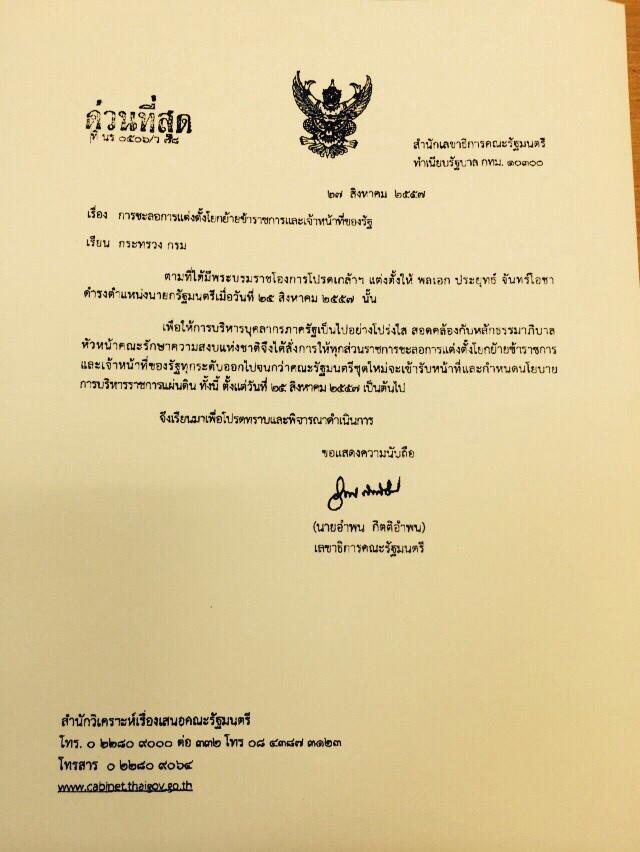 โดยระบุว่าตามที่ได้มีพระบรมราชโองการโปรดเกล้าฯ แต่งตั้งให้พล.อ.ประยุทธ์ จันทร์โอชา ดำรงตำแหน่งนายกรัฐมนตรี เมื่อวันที่ 25 ส.ค.57 นั้น