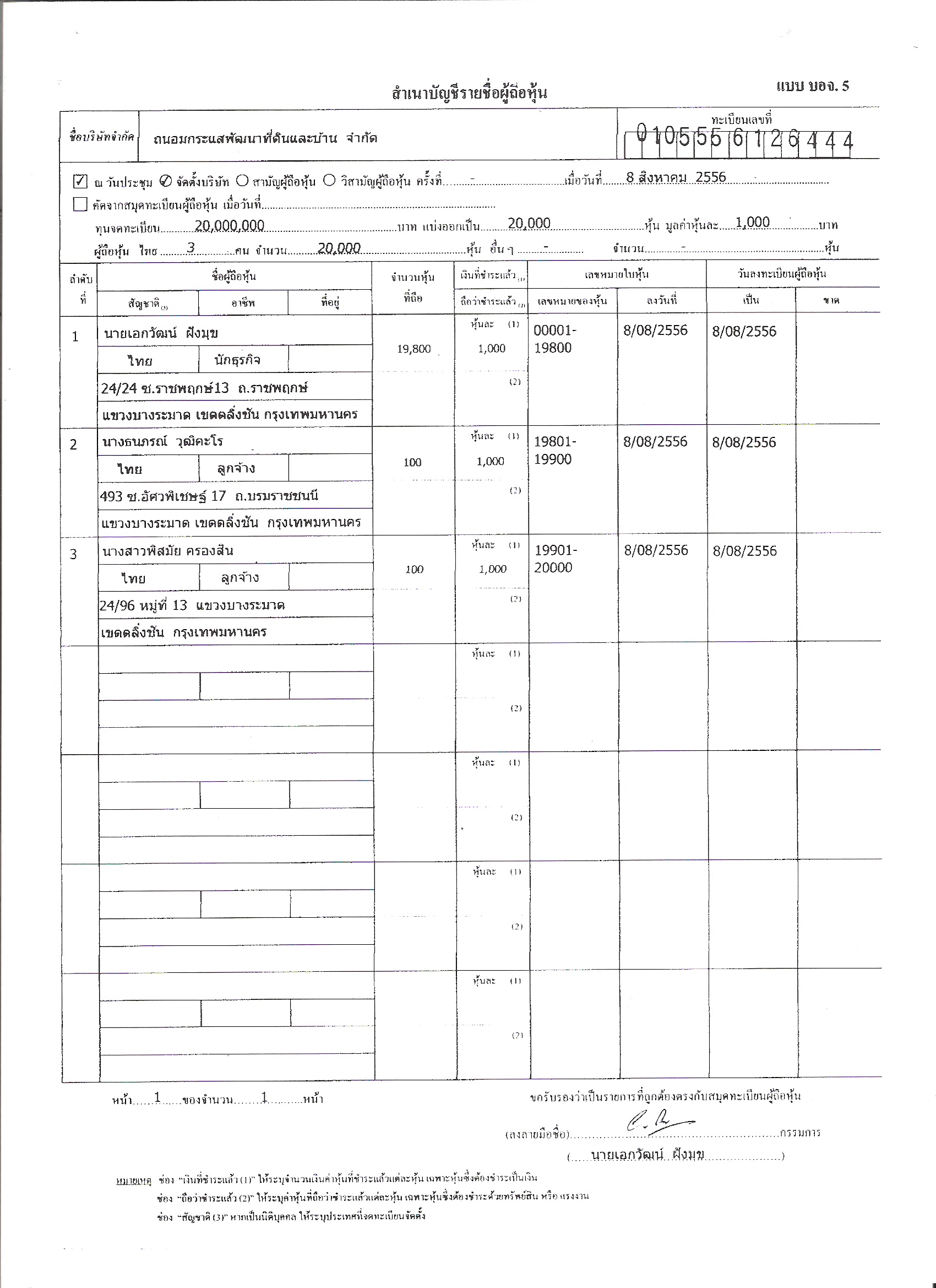 รวม 20,000 หุ้น มูลค่าหุ้นละ 1,000 บาท