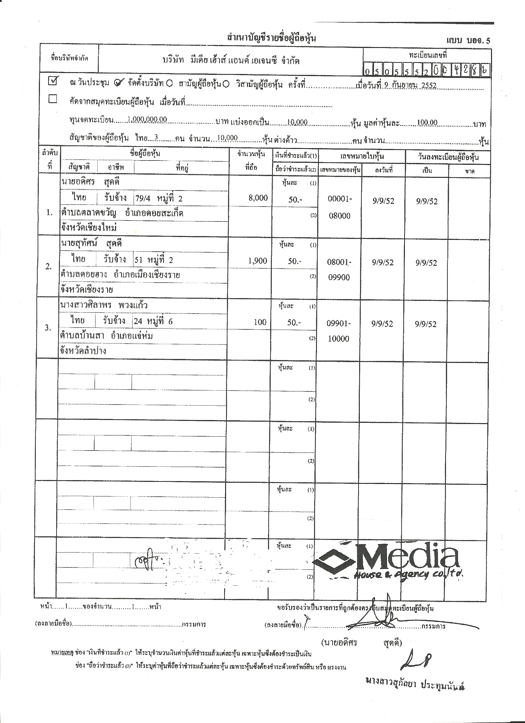 บริษัท มีเดีย เฮ้าส์ แอนด์ เอเจนซี จำกัด ยื่นจดทะเบียนต่อนายทะเบียนหุ้นส่วนบริษัทจังหวัดเชียงใหม่ เมื่อวันที่ 15 กันยายน 2552 ทุน 1 ล้านบาท ประกอบธุรกิจผลิตสื่อโฆษณา ประชาสัมพันธ์และสื่อสิ่งพิมพ์ ที่ตั้งเลขที่ 82/3 หมู่ที่ 2 ต.ตลาดขวัญ อ.ดอยสะเก็ด จ.เชียงใหม่ (ต่อมาย้ายสำนักงานที่ตั้งเป็น191 หมู่ที่ 3 ตำบลสันทรายน้อย อำเภอสันทราย จังหวัดเชียงใหม่) มีผู้ถือหุ้น 3 ราย