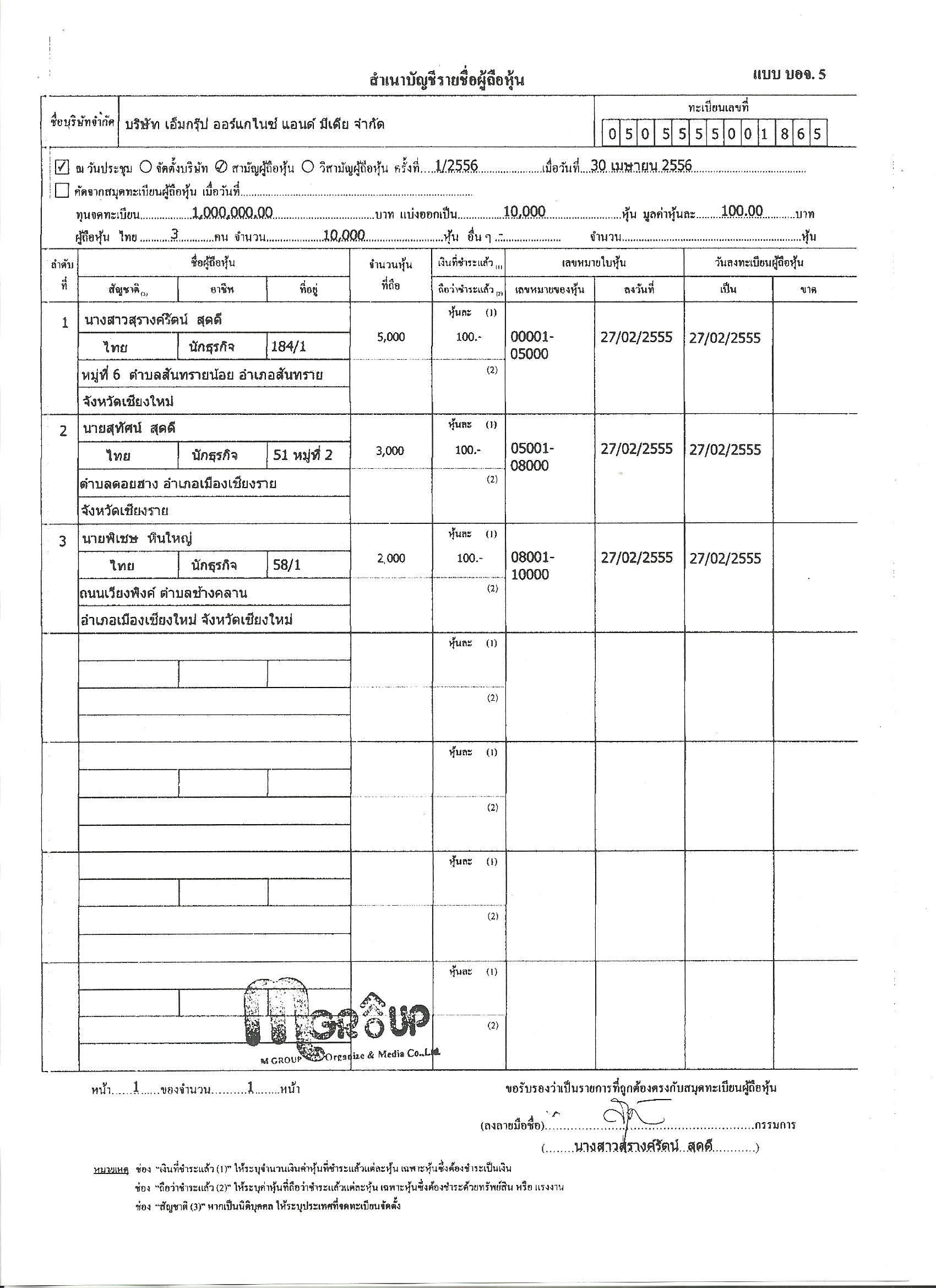 1. นายอดิศร สุดดี อายุ 35 ปี อยู่บ้านเลขที่ 79/2 หมู่ที่ 2 ต.ตลาดขวัญ อ.ดอยสะเก็ด จ.เชียงใหม่ จำนวน 8,000 หุ้น