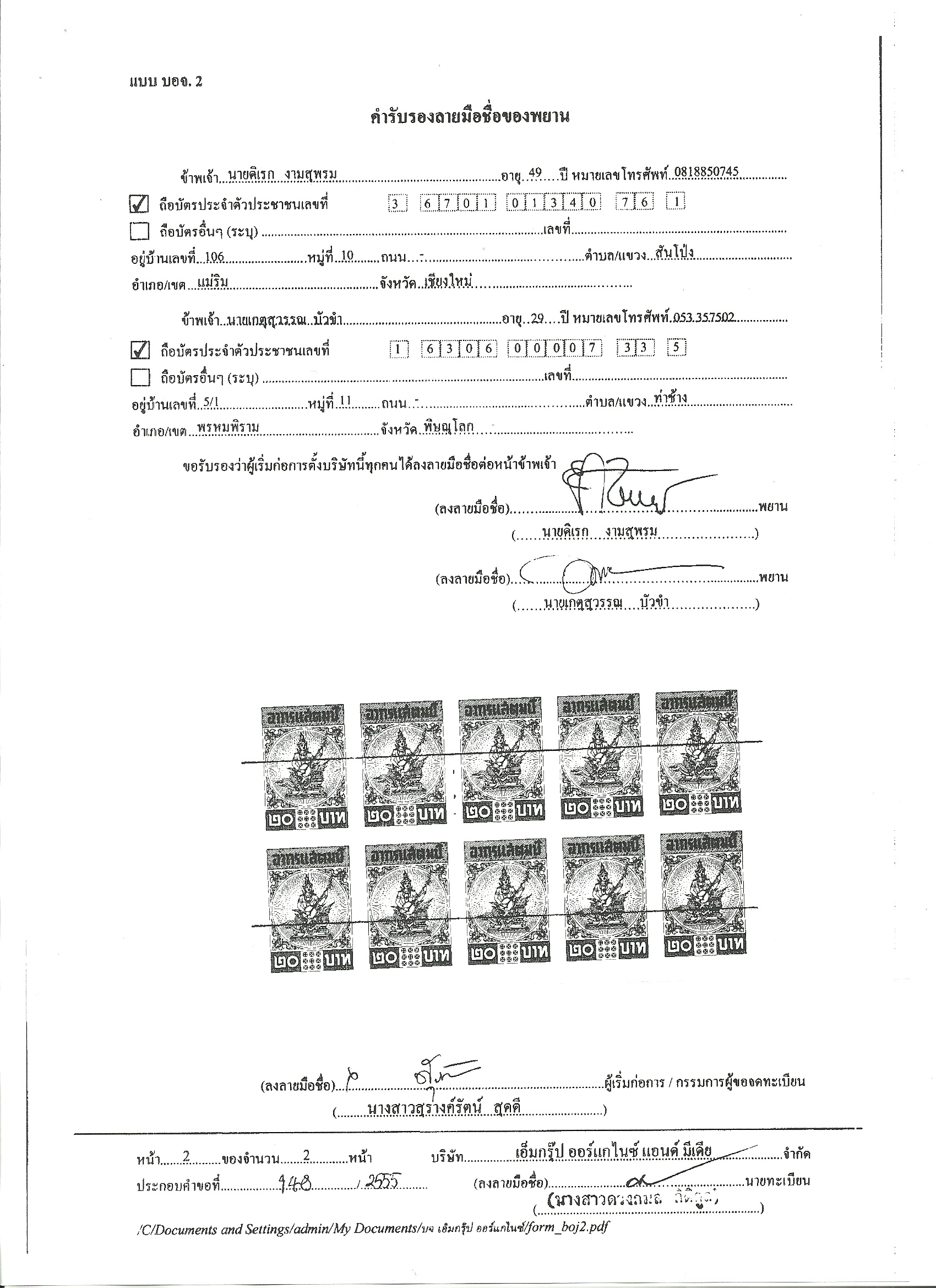 มีนายดิเรก งามสุพรม อยู่บ้านเลขที่ 106 หมู่ที่ 10 ต.สันโป่ง อ.แม่ริม จ.เชียงใหม่ และนายเกตุสุรรณ บัวขำ อยู่บ้านเลขที่ 5/1 หมู่ที่ 11 ต.ท่าช้าง อ.พรหมพิราม จ.พิษณุโลก ลงลายมือเป็นพยาน