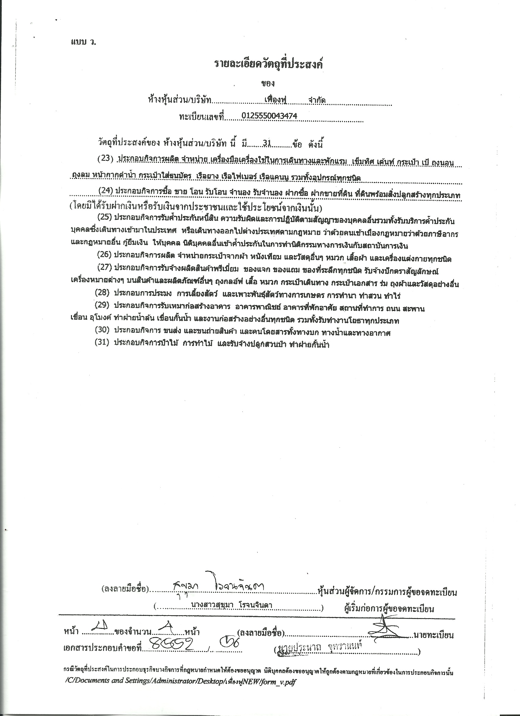 โดยที่ บริษัท เฟื่องฟู จำกัด โดยนางสาวสุขุมา โรจนจินดา กรรมการ บริษัท มอบอำนาจให้ นาย กฤตฐ์นคร รอบรู้ อยู่บ้านเลขที่ 42/322 หมู่ที่ 3 ซอยนิมิตใหม่ 40 ถนนนิมิตใหม่ แขวงสามวาตะวันออก เขตคลองสามวา กรุงเทพฯ ยื่นจดทะเบียนแก้ไขเพิ่มหนังสือบริคณห์สนธิ ข้อ 3 (วัตถุประสงค์ของบริษัท) จากเดิม 24 ข้อ เพิ่มเป็น 31 ข้อ โดยในข้อ 31 ข้อสุดท้ายระบุว่า “ประกอบกิจการป่าไม้ การทำไม้ และรับจ้างปลูกสวนป่า ทำฝายกั้นน้ำ”เมื่อ วันที่ 5 ก.ย.56 (เอกสารประกอบ)
