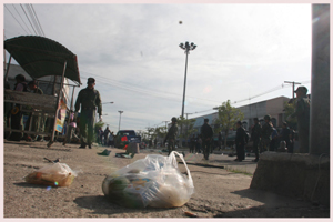 บรรยายภาพ : ถุงอาหารที่ชาวบ้านใส่บาตรพระและสามเณรตกอยู่ริมถนน หลังคนร้ายลอบวางระเบิดทหารชุด รปภ.พระในเขต อ.เมือง จ.ปัตตานี เมื่อเช้าตรู่วันอังคารที่ 23 ส.ค.2554 (ภาพโดย อับดุลเลาะ หวังหนิ)
