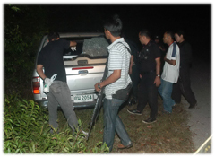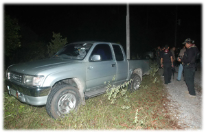 บรรยายภาพ : 1-4 รถกระบะที่คนร้ายจอดทิ้งไว้แล้วหลบหนีเข้าป่า หลังเปิดปฏิบัติการใช้อาวุธสงครามยิงถล่มฐานของหน่วยพัฒนาสันติที่ บ้านเกาะแลหนัง อ.เทพา จ.สงขลา (ภาพทั้งหมดโดย สุเมธ ปานเพชร)