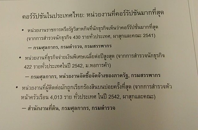 - หน่วยงานราชการหรือรัฐวิสาหกิจนักธุรกิจเห็นว่ามีการคอร์รัปชั่นมากที่สุด คือ กรมศุลกากร กรมตำรวจ และกรมสรรพากร