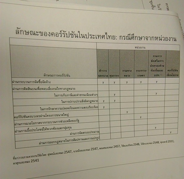 สุดท้ายลักษณะการคอร์รัปชั่นในประเทศไทย จากการศึกษาตามหน่วยงานพบว่า ตำรวจนครบาล ศุลกากร กรมทางหลวง กระทรวงเกษตรฯ องค์กรปกครองส่วนท้องถิ่น คอร์รัปชั่นผ่าน "กระบวนการจัดซื้อจัดจ้าง" มากที่สุด การคอร์รัปชั่นในรูปแบบการเก็บภาษีและค่าธรรมเนียมต่างๆ พบใน 2 หน่วยงาน คือ กรมศุลกากร และองค์กรปกครองส่วนท้องถิ่น