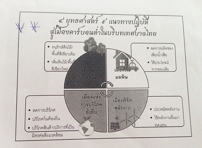 นางธารี กล่าวอีกว่า ขณะที่นโยบายสิ่งแวดล้อมระดับประเทศถูกเหยียบย่ำไปกับนโยบายรถคันแรกแล้ว ตอนนี้หน่วยงานที่สามารถจะช่วยขับเคลื่อนให้เกิดกระแสภายในพื้นที่ คือ ท้องถิ่น เพราะท้องถิ่นมีศักยภาพ มีคน และมีความพยายามที่ดำเนินกิจกรรมเกี่ยวกับการทำให้เมืองเป็นเทศบาลคาร์บอนต่ำได้ โดยใช้ "4 กลยุทธ์ 9 แนวทางปฏิบัติ" ของโครงการเทศบาลคาร์บอนต่ำ เพื่อลดปริมาณการปล่อยก๊าซคาร์บอนจาการกิจกรรมต่างๆ ภายในเมืองออกสู่บรรยากาศให้น้อยที่สุด ได้แก่
