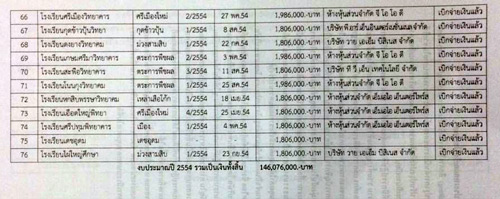 หมายเหตุ สำนักข่าวอิศรา www.isranews.org : เป็นรายชื่อและสถานะสัญญาของโรงเรียนในสังกัดสำนักงานเขตพื้นที่การศึกษาประถมศึกษา ที่ได้รับงบแปรญัตติ ทั้งในปี 2554 และ2555 เพื่อนำไปใช้ในการก่อสร้างสนามฟุตซอล และอุปกรณ์ประกอบ ใน 4 จังหวัด ได้แก่ อุบลราชธานี อำนาจเจริญ มุกดาหาร และศรีสะเกษ รวมจำนวนโรงเรียน 103 แห่ง วงเงิน 244,818,000 บาท ของสำนักงานการตรวจเงินแผ่นดิน (สตง.) ซึ่งปรากฎรายชื่อผู้รับเหมาในกลุ่มของ น.ส.เบญจพันธ์ บุญบงการ ,นายยี พณิชยา จำนวน 6-7 แห่ง ได้รับงานไปเกือบทั้งหมด ประกอบไปด้วย บริษัท พี.อาร์.เอ็นอินเตอร์เนชั่นแนล จำกัด , บริษัททีวีเอ็น เทคโนโลยี จำกัด , บริษัทแกรนด์สยาม 98 จำกัด, หจก.จีโอโอดี ,บริษัท วอร์เตอร์ฮิลแลนด์ ,หจก.เอ็มเอไอ เอ็นเตอร์ไพร์ส และบริษัทวายเอเอ็ม บิสิเนส จำกัด