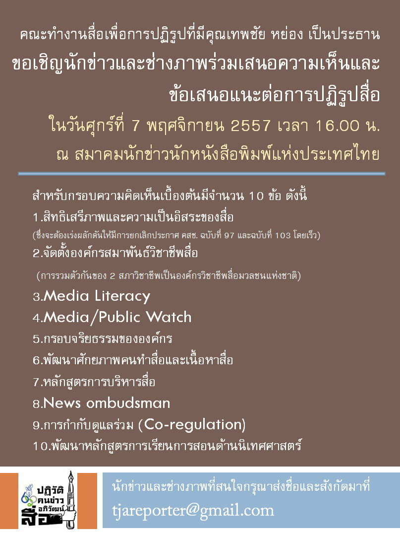 เชิญนักข่าวและช่างภาพร่วมเสนอความเห็นต่อการปฏิรูปสื่อ ศุกร์ที่7พ.ย.นี้