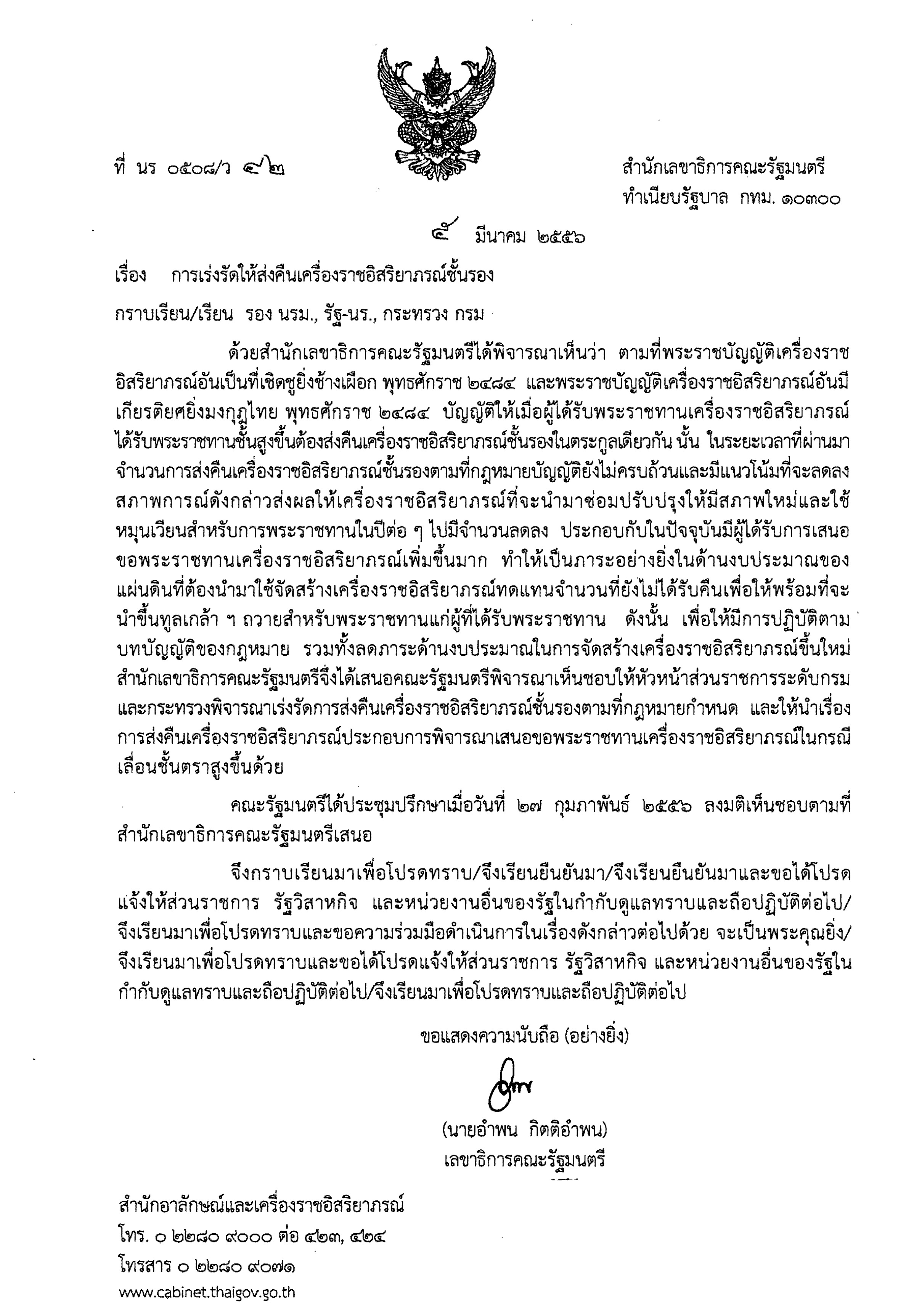 แหล่งข่าวกล่าวต่อไปว่า ก่อนหน้านี้ในช่วงรัฐบาล น.ส.ยิ่งลักษณ์ ชินวัตร อดีตนายกรัฐมนตรี ทางสำนักเลขาธิการคณะรัฐมนตรี ได้มีการนำเสนอเรื่องนี้ให้ที่ประชุมครม.รับทราบเป็นทางการไปแล้วตั้งแต่ปี 2556 โดยเสนอให้พิจารณาเห็นชอบให้หัวหน้าส่วนราชการระดับกรมและกระทรวงพิจารณาเร่งรัดการส่งคืนเครื่องราชชั้นรองตามที่กฎหมายกำหนด ซึ่งครม.ได้มีมติ เมื่อวันที่ 27 ก.พ.2556 เห็นชอบตามที่สำนักเลขาธิการครม.เสนอ