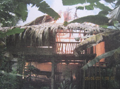 แล้วเช้าวันรุ่งขึ้น ไม่มีคำบอกกล่าวใดๆ ระหว่างที่ทุกคนอยู่บนบ้าน แล้วเห็นว่าไฟเริ่มไหม้หลังคาบ้าน จนต้องกระโดดหนีลงจากบ้านกันแบบไม่ทันตั้งตัว ได้แต่มายืนดูบ้านถูกไฟเผา ไม่มีทรัพย์สินข้าวของใดๆให้เอามาได้ ทั้งมีด จอบ เสียม ข้าวของเครื่องใช้ทุกอย่าง เสื้อผ้า เตหน่า(เครื่องดนตรี) กี่เอวทอผ้า เงินจากการขายพริกประมาณ 3,000 บาท ก็อยู่ในบ้าน และยุ้งข้าวที่ถูกเผาไปพร้อมกับข้าวกว่า 200 ถัง