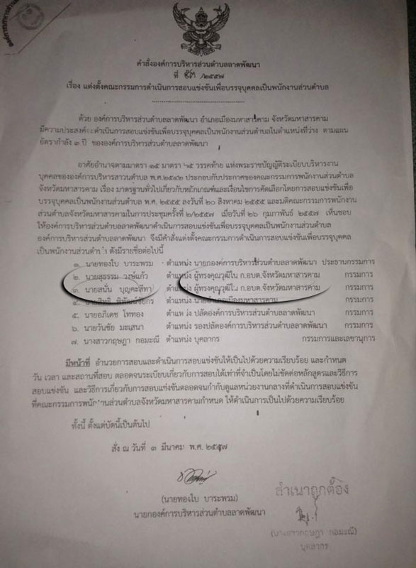 โดยในเอกสารคำสั่ง อบต.ลาดพัฒนา หนึ่งใน 3 อบต. ที่ถูกตั้งข้อสงสัยกรณีนี้ มีคำสั่งที่ 53/2557 ลงวันที่ 3 มีนาคม 2557 เรื่อง แต่งตั้งคณะกรรมการดำเนินการสอบแข่งขันเพื่อบรรจุบุคคลเป็นพนักงานส่วนตำบล จำนวนทั้งสิ้น 7 คน