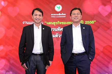 ธนาคารกสิกรไทยเปิดแผนธุรกิจปี 2558 ชูยุทธศาสตร์ผู้นำอันดับหนึ่งด้านดิจิตอลแบงกิ้งและบริการด้านธุรกรรมทางการเงิน (Transaction Banking) พร้อมประกาศความเป็นธนาคารแห่งเออีซีบวกสามด้วยเครือข่ายบริการทั่วภูมิภาค เพื่อรองรับเม็ดเงินลงทุนหมุนเวียนในธุรกิจข้ามชาติระหว่างไทยและภูมิภาค ตั้งเป้าภาพรวมสินเชื่อขยายตัว 8-9% สัดส่วนรายได้ค่าธรรมเนียมเป็น 40% ดูแลสัดส่วน NPL ไม่เกิน 2.3% ครองอันดับหนึ่งการเป็นธนาคารหลักของลูกค้าทุกกลุ่ม มั่นใจเติบโตสอดคล้องกับการขยายตัวทางเศรษฐกิจของประเทศ คาดการณ์ปี 2558 จีดีพีโตในกรอบ 3.5-4.5%