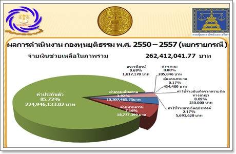 ทั้งนี้ผู้สื่อข่าวอิศรา ได้รวบรวมรายงานข้อมูลจากเว็บไซต์ www.rlpd.go.th ซึ่งเป็นเว็บไซต์ของกรมคุ้มครองสิทธิเสรีภาพ กระทรวงยุติธรรม เปิดเผยผลการดำเนินงานของกองทุนยุติธรรม ตั้งแต่ พ.ศ.2550-2557 พบว่า กองทุนฯ จ่ายเงินช่วยเหลือในภาพรวมกว่า 262 ล้านบาท โดยแยกตามลำดับ ได้แก่