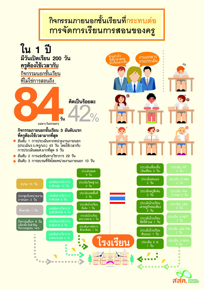 ดร.ไกรยส ภัทราวาท ผู้เชี่ยวชาญด้านเศรษฐศาสตร์การศึกษา สสค. กล่าวถึงการสำรวจภายนอกชั้นเรียนที่กระทบต่อการจัดการเรียนการสอนของครูว่า การสำรวจดังกล่าวเป็นการสะท้อนสถานการณ์การทำงานของครูภายใต้ระบบการศึกษาไทยปัจจุบัน โดยสำรวจครูผู้ได้รับรางวัลครูสอนดีจาก สสค. ที่มีอายุเฉลี่ยและวิริยะฐานะสูงกว่าครูทั่วไปกระจายตัวครอบคลุมโรงเรียนทุกสังกัดทั่วประเทศ จำนวน 427 ตัวอย่าง ระหว่างวันที่ 15 กันยายนถึง 15 ตุลาคม 2557 ที่ผ่านมา พบว่า ใน 1 ปี มีจำนวนวันเปิดเรียนทั้งหมด 200 วัน ครูต้องใช้เวลากับกิจกรรมภายนอกชั้นเรียนที่ไม่ใช่การจัดการเรียนการสอนเฉพาะวันธรรมดาถึง 84 วัน หรือคิดเป็น 42%
