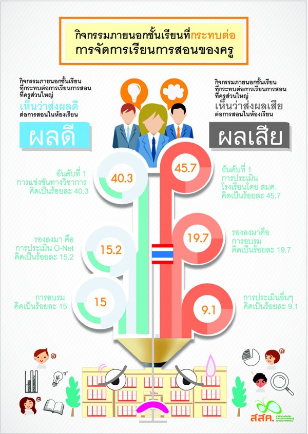 "ครูส่วนใหญ่ให้ความเห็นว่า กิจกรรมภายนอกชั้นเรียนที่ส่งผลดีต่อการเรียนการสอน ได้แก่ การแข่งขันทางวิชาการ การประเมิน O-NET การอบรม และการประเมินการอ่าน ส่วนกิจกรรมที่ครูส่วนใหญ่เห็นว่า ส่งผลเสียต่อการเรียนการสอนคือ การประเมินโรงเรียนโดยสมศ. การอบรม และการประเมินอื่นๆ ซึ่งหน่วยงานประเมินที่ครูส่วนใหญ่อยากให้มีการปรับปรุงมากที่สุดคือ สมศ. 98% รองลงมาคือเขตพื้นที่ และสำนักงานคณะกรรมการการศึกษาขั้นพื้นฐาน (สพฐ.) 1.7% โดยเสนอให้ปรับปรุงวิธีการประเมินที่เน้นผลลัพธ์ของเด็กมากกว่าเอกสารและลดภาระการประเมินลง"