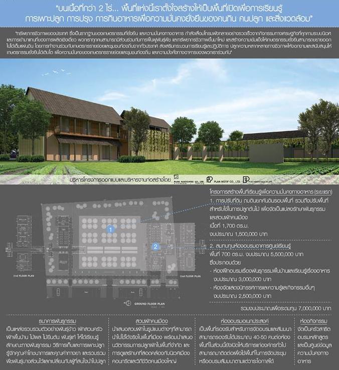 ผู้สื่อข่าวรายงานว่า การสมทบทุนสร้าง ‘พื้นที่เรียนรู้เพื่อความมั่นคงทางอาหาร’ เพื่อเป็นพื้นที่เรียนรู้เกี่ยวกับการเพาะปลูก การปรุง การกินอาหาร เพื่อความมั่นคงของคนกิน คนปลูก และสิ่งแวดล้อม รวมงบประมาณก่อสร้างทั้งสิ้น 7 ล้านบาท คาดว่าจะใช้ระยะเวลาก่อสร้าง 3 ปี