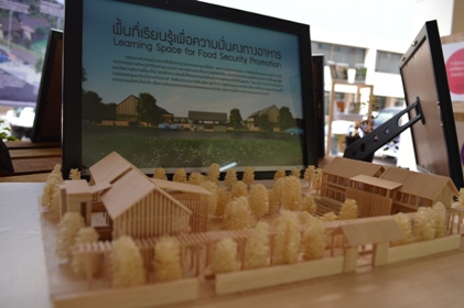 โมเดลจำลอง 'พื้นที่การเรียนรู้เพื่อความมั่นคงทางอาหาร' ตั้งตระหง่านอยู่มุมหนึ่งบริเวณใต้โถงอาคารพิทยพัฒน์ ม.สุโขทัยธรรมาธิราช (มสธ.) เหนือขึ้นไปปรากฎกรอบรูปสีดำขลับบรรจุภาพลงสีของพื้นที่การเรียนรู้ฯ พร้อมข้อความชวนสะกิดให้ตระหนักขึ้นว่า