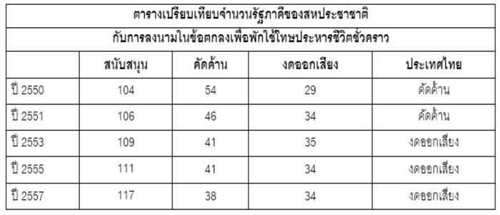จำนวนรัฐภาคีสนับสนุนให้พักการใช้โทษประหารชีวิตมากขึ้น ขณะที่ประเทศไทยงดออกเสียงเป็นปีที่สาม และไม่มีการประหารชีวิตติดต่อกันเป็นปีที่ 5