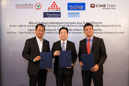 นายทวิช ธนะชานันท์ (ซ้าย) ผู้ช่วยกรรมการผู้จัดการ ธนาคารกสิกรไทย และนายพรชัย ปัทมินทร์ (ขวา) รองกรรมการผู้จัดการใหญ่ สายธุรกิจขนาดใหญ่ ธนาคารซีไอเอ็มบี ไทย ร่วมลงนามในสัญญาสนับสนุนเงินกู้ จำนวน 3,400 ล้านบาทให้กับนายปรีชา นันท์นฤมิต (กลาง) ประธานกรรมการ บมจ. อี ฟอร์ แอล เอม ซึ่งประกอบธุรกิจนำเข้าอุปกรณ์ทางการแพทย์ และเครื่องมือทางวิทยาศาสตร์ เพื่อซื้อกิจการ บริษัท วุฒิศักดิ์ คลินิก อินเตอร์ กรุ๊ป เจ้าของคลินิกเวชกรรมและความงามรายใหญ่ของไทย มีสาขากว่า 100 สาขาทั่วประเทศ ณ โรงแรมแกรนด์ ไฮแอท เอราวัณ เมื่อเร็วๆ นี้