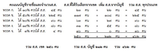 ของประชาชนเป็น ๔ ต่อ ๕ ทำให้คะแนนทุกคะแนนมีความหมาย ไม่ตกน้ำโดยใช้ระบบเลือกบัญชีพรรคและเลือกคนในแต่ละเขต โดยให้จำนวนสมาชิกสภาผู้แทนราษฎรแต่ละพรรคจะถูกกำหนดโดยสัดส่วนที่ประชาชนลงคะแนน เลือกพรรคนั้น ๆ แต่ให้ผู้สมัครอิสระสามารถสมัครอิสระได้ในเขตเลือกตั้ง ดังตัวอย่างต่อไปนี้