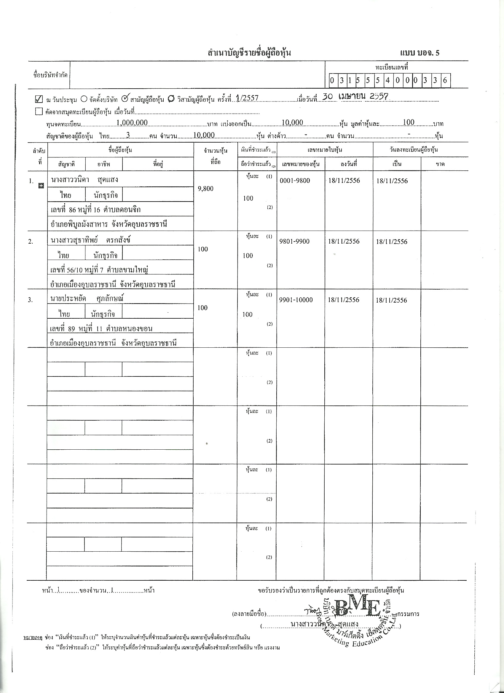 3.น.ส.โสรินทร์ เคลื่อนสูงเนิน อยู่บ้านเลขที่ 527 หมู่ที่ 9 ต.ลำปลายมาศ อ.ลำปลายมาศ จ.บุรีรัมย์ 100 หุ้น และย้ายสำนักงานที่ตั้งเลขที่ 222 หมู่ที่ 11 ห้อง 3 ตำบลหนองขอน อำเภอเมืองอุบลราชธานี จังหวัดอุบลราชธานี และที่ตั้งสำนักงานบัญชีเลขที่ 56/10 หมู่ที่ 7 ตำบลขามใหญ่ อำเภอเมืองอุบลราชธานี จังหวัดอุบลราชธานี