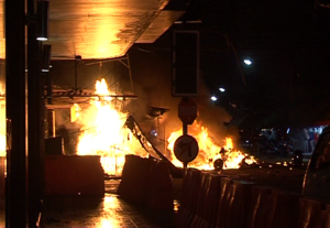 บรรยายภาพ : เพลิงลุกโชนเผาอาคารบ้านเรือนริมถนนหลังเกิดระเบิดครั้งรุนแรงใน อ.สุไหงโก-ลก จ.นราธิวาส เมื่อค่ำวันที่ 16 ก.ย.