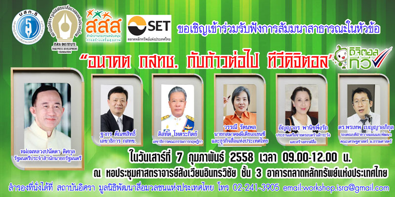 สถาบันอิศรา มูลนิธิพัฒนาสื่อมวลชนแห่งประเทศไทย โดยผู้อบรมหลักสูตรผู้บริหารการสื่อสารมวลชนระดับกลาง (บสก.) รุ่นที่ 5 จัดสัมมนาสาธารณะ หัวข้อ “อนาคต กสทช. กับก้าวต่อไป ทีวีดิจิตอล” ในวันเสาร์ที่ 7 กุมภาพันธ์ 2558 เวลา 09.00 – 12.00 น. ณ ห้องประชุมศาสตราจารย์สังเวียน อินทรวิชัย ชั้น 3 อาคารตลาดหลักทรัพย์ โดยมี ม.ล.ปนัดดา ดิศกุล รัฐมนตรีประจำสำนักนายกรัฐมนตรี และปลัดสำนักนายกรัฐมนตรี กล่าวปาฐกถาพิเศษ หัวข้อ “โทรทัศน์ไทยในอนาคต” และได้รับเกียรติจากวิทยากรผู้ทรงคุณวุฒิเข้าร่วมการเสวนาฯ ประกอบด้วย นายฐากร ตัณฑสิทธิ์ เลขาธิการคณะกรรมการกิจการกระจายเสียงกิจการโทรทัศน์ และกิจการโทรคมนาคมแห่งชาติ นายดิสทัต โหตระกิตย์ เลขาธิการคณะกรรมการกฤษฎีกา นางวรรณี รัตนพล นายกสมาคมมีเดียเอเยนซี่และธุรกิจสื่อแห่งประเทศไทย นางอรัญาอร พานิชพึ่งรัถ ประธานเครือข่ายครอบครัวเฝ้าระวังและสร้างสรรค์สื่อ และ ดร.พรเทพ เบญญาอภิกุล รองคณบดีฝ่ายวางแผนและพัฒนา คณะเศรษฐศาสตร์ มหาวิทยาลัยธรรมศาสตร์