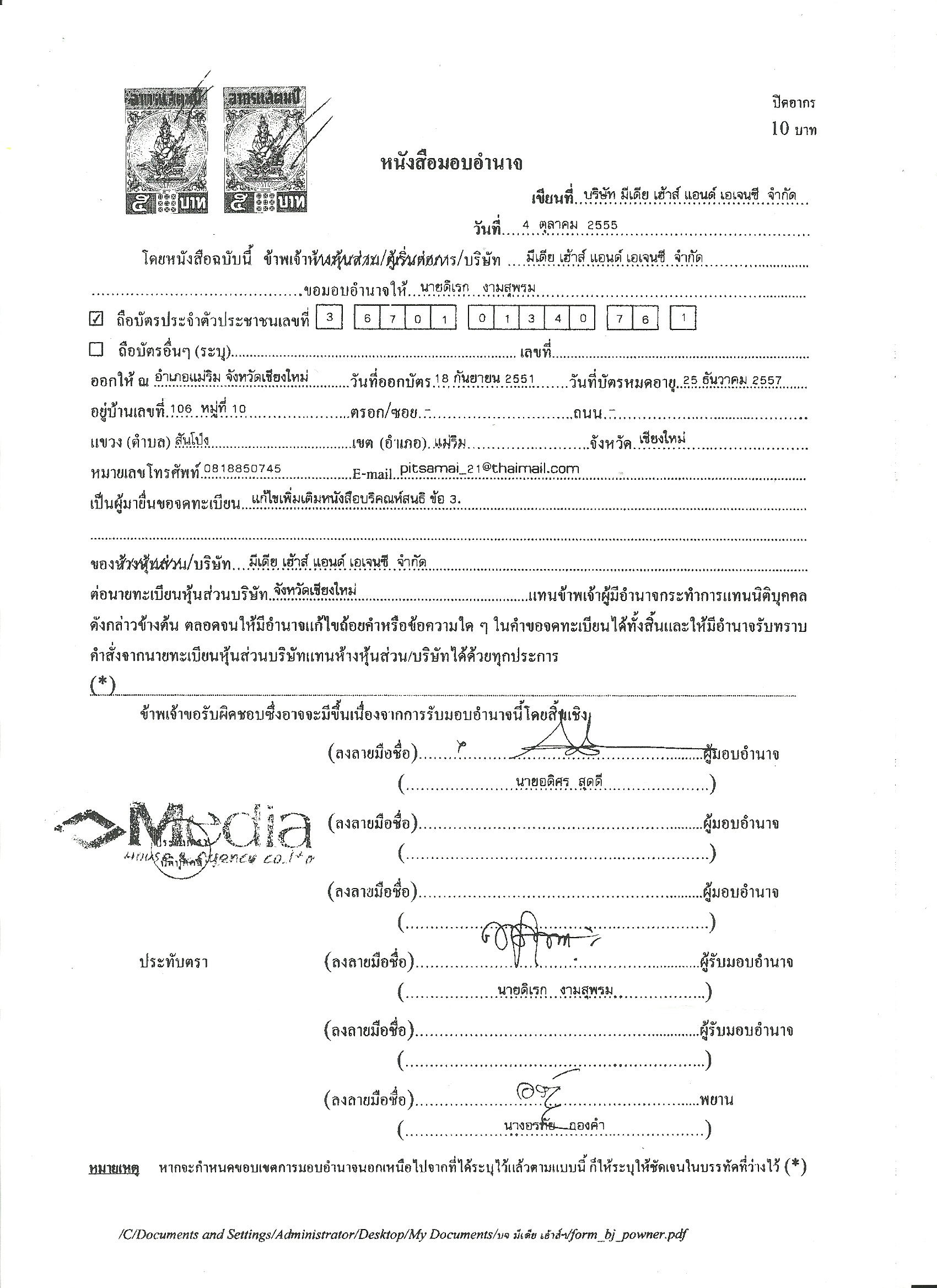 ทั้งนี้ “ตัวละคร”ที่ชี้ให้เห็นถึงความเชื่อมโยงระหว่าง 3 บริษัท ประการสำคัญคือ ในการยื่นจดทะเบียนจัดตั้งบริษัท มีเดีย เฮ้าส์ แอนด์ เอเจนซี จำกัด ต่อนายทะเบียนหุ้นส่วนบริษัทจังหวัดเชียงใหม่ เมื่อวันที่ 15 กันยายน 2552 มีชื่อ นายดิเรก งามสุพรม อายุ 46 ปี และนางพิศมัย งามสุพรม อายุ 44 ปี อยู่บ้านเลขที่ 106 หมู่ที่ 10 ต.สันโป่ง อ.แม่ริม จ.เชียงใหม่ ลงลายมือชื่อเป็นพยาน (แบบ อบจ.2)