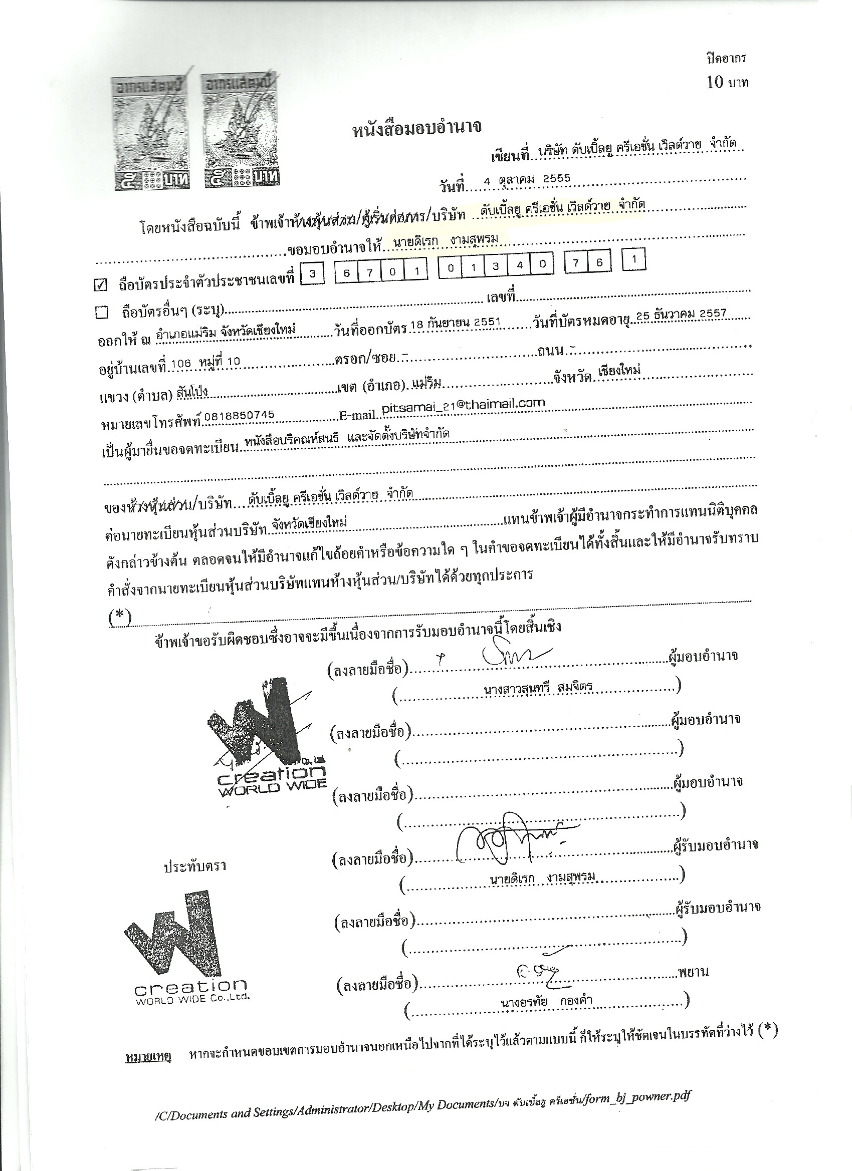 และในการยื่นจดทะเบียนจัดตั้ง บริษัท ดับเบิ้ลยู ครีเอชั่น เวิลด์วาย จำกัด เมื่อวันที่ 22 ต.ค.55 นายดิเรก งามสุพรม เป็นผู้รับมอบอำนาจจากกรรมการบริษัทฯ ยื่นขอจดทะเบียนหนังสือบริคณสนธิและจัดตั้งบริษัทต่อนายทะเบียนหุ้นส่วนบริษัทจังหวัดเชียงใหม่ และนายดิเรก ยังลงมือชื่อเป็นพยานในการจดทะเบียนจัดตั้งบริษัทอีกด้วย