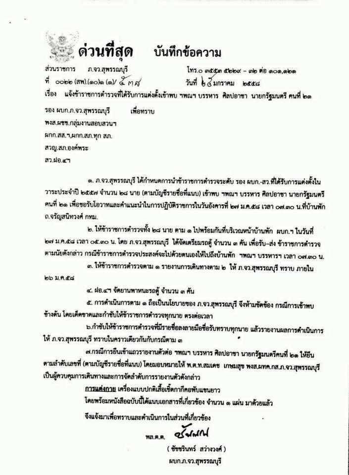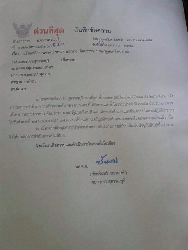 ล่าสุด พล.ต.ต.ชัชชรินทร์ สว่างวงศ์ ผบก.ภ.จว.สุพรรณบุรี ทำหนังสือด่วนที่สุด เรื่อง เเจ้งยกเลิกการเข้าพบ ฯพณฯ บรรหาร ศิลปอาชา นายกรัฐมนตรี คนที่ 21 เเล้ว โดยให้เหตุผลว่า เนื่องจากมีเหตุผลบางประการประกอบกับสถานการณ์บ้านเมืองในปัจจุบันไม่เอื้ออำนวย