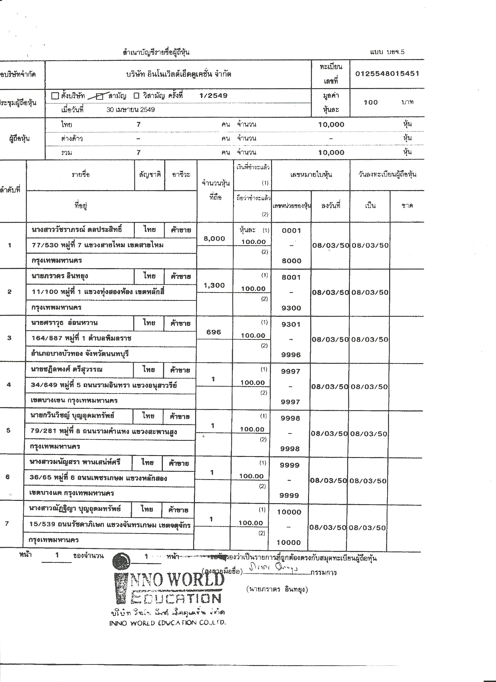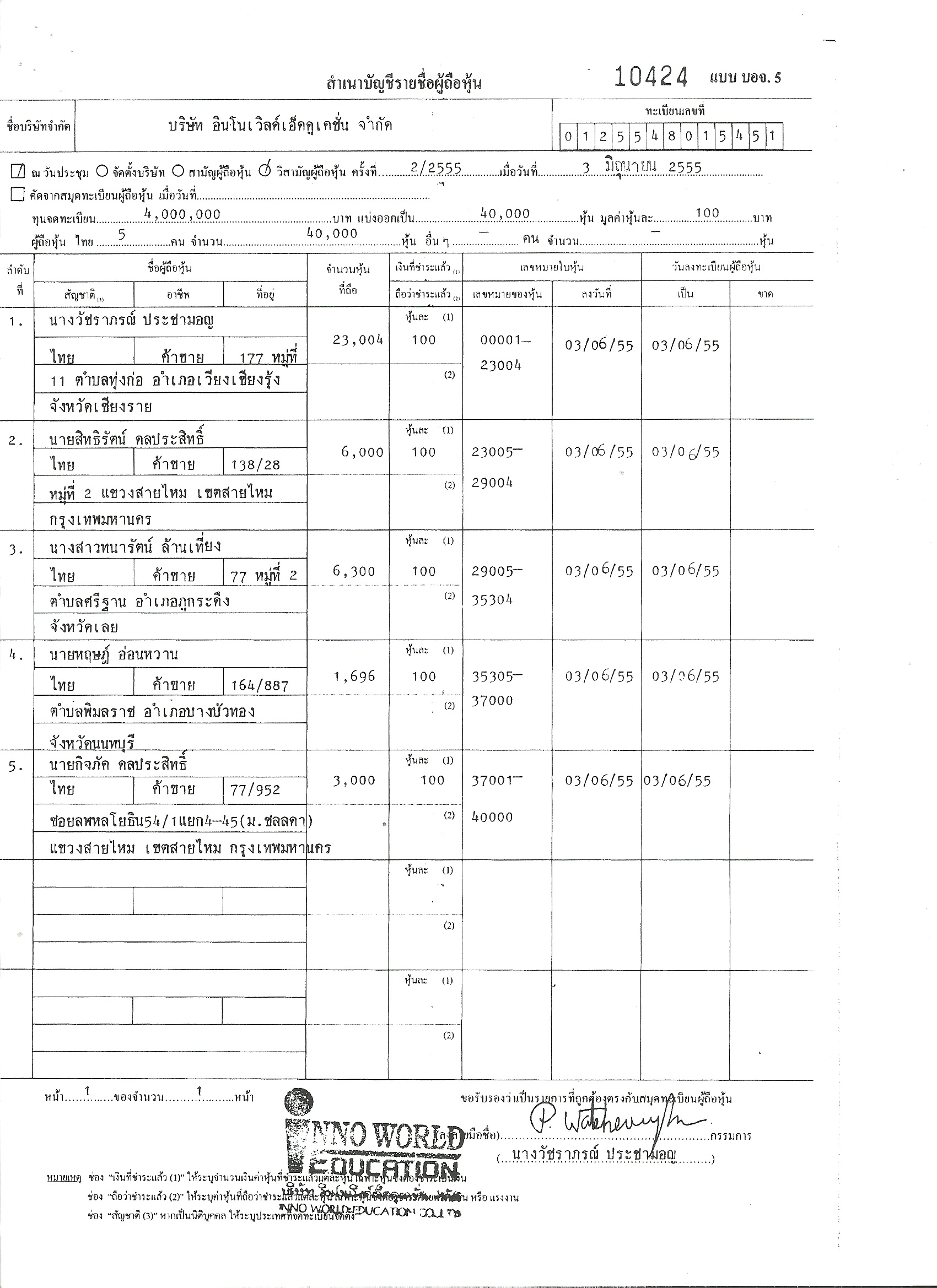 รวม บริษัท อินโนเวิลด์เอ็ดดูเคชั่น จำกัด จดทะเบียนเปลี่ยนแปลงผู้ถือหุ้นประมาณ 15 ครั้ง (ดูตาราง)