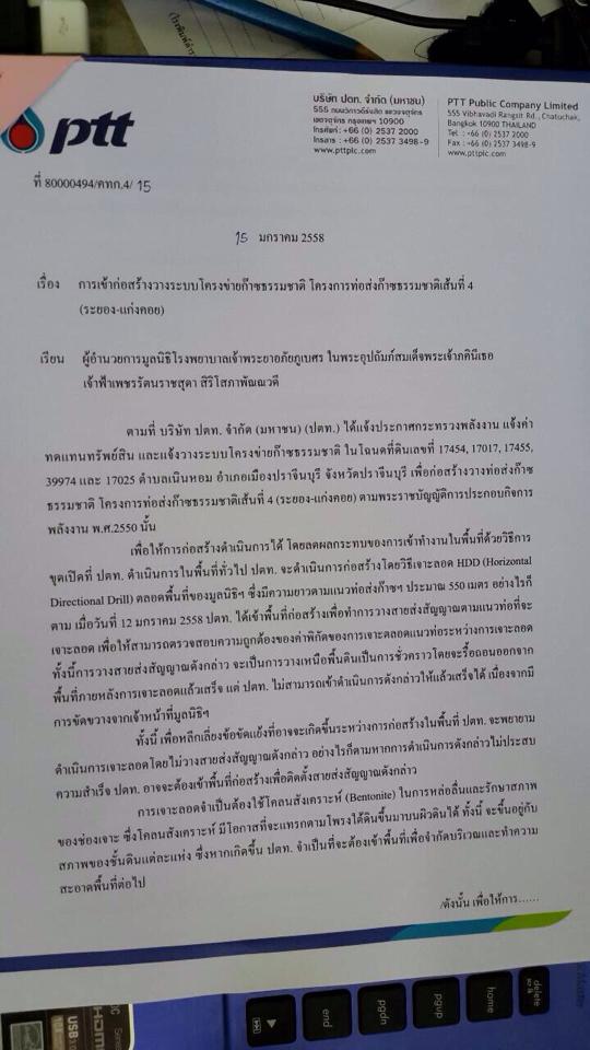 เลขาธิการมูลนิธิ รพ.เจ้าพระยาอภัยภูเบศร กล่าวว่า ก่อนหน้าที่จะมีเหตุการณ์โคลนทะลักเข้ามาในพื้นที่มีหนังสือจากปตท.เพียงฉบับเดียวลงวันที่ 15 มกราคม 2558 แจ้งมายังมูลนิธิว่า ในการเจาะลอดพื้นที่อาจจะมีโคลนสังเคราะห์แทรกเข้ามาและอาจจะเข้ามาดำเนินการทำความสะอาดต่อไป และเมื่อมีเหตุการณ์เกิดขึ้นในวันที่ 24 มกราคม เจ้าหน้าที่จากปตท.ก็มา แต่ไม่มีหนังสือขออนุญาตเข้าพื้นที่และไม่ได้แจ้งมูลนิธิฯ ล่วงหน้า ทางเจ้าหน้าที่รักษาความปลอดภัยจึงไม่อนุญาตให้เข้า เนื่องจากมีสมุนไพรหายากหลายชนิด