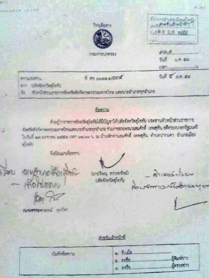 โดยมีเนื้อหา ระบุว่า ผู้ว่าราชการจังหวัดสุโขทัย มีบัญชาให้ปลัดจังหวัดสุโขทัย ประสานหัวหน้าส่วนราชการจังหวัดสังกัดกระทรวงมหาไทย และนายอำเภอทุกอำเภอ ร่วมกันเข้าอวยพรนายสมศักดิ์ เทพสุทิน อดีตรองนายกรัฐมนตรี ในวันที่ 13 ม.ค.2558 เวลา 09.00 น. ณ บ้านพักนายสมศักดิ์ ต.ปากแคว อ.เมือง จ.สุโขทัย