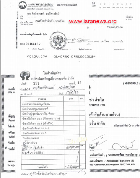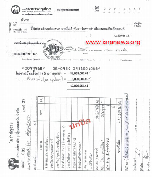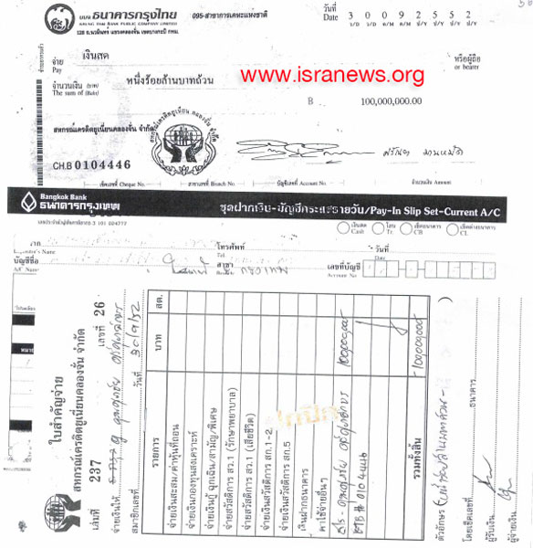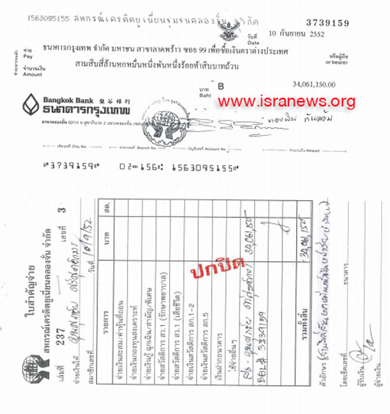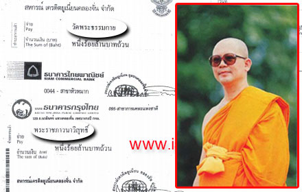 เช็คที่จ่าย พระราชภาวนาวิสุทธิ์ (ชื่อเดิมหลวงพ่อธมมชโย ปัจจุบันคือพระเทพญาณมหามุนี) และวัดพระธรรมกาย โดยตรง 4 ใบ รวม316,780,000 บาท