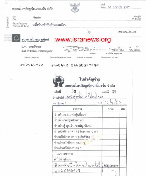 เช็คที่จ่าย เป็นเงินสด ไม่ระบุชื่อผู้รับ 4 ใบ มูลค่า 311,339,661 บาท
