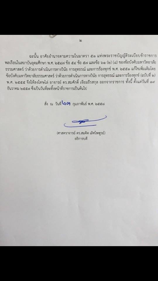 คำสั่งธรรมศาสตร์ไล่ออก สมศักดิ์ เจียมธีรสกุล ว่อนเน็ต! ฐานทำผิดวินัยร้ายแรง ลาไปปฏิบัติงานในประเทศ ทั้งที่ไม่ได้รับอนุมัติ แจ้งติดตามตัวกลับมาสอนหนังสือแล้วยังเพิกเฉย- "สมคิด เลิศไพฑูรย์"อธิการฯ ยันลงนามจริง