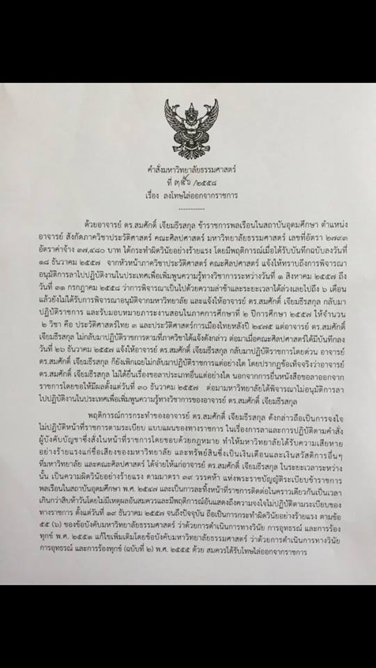 ผู้สื่อข่าวสำนักข่าวอิศรา www.isranews.org รายงานว่า ในช่วงเย็นวันที่ 24 ก.พ.58 ที่ผ่านมา ได้มีผู้นำคำสั่งมหาวิทยาลัยธรรมศาสตร์ เรื่องลงโทษไล่ออก นายสมศักดิ์ เจียมธีรสกุล จากการเป็นอาจารย์สังกัด ภาควิชาประวัติศาสตร์ คณะศิลปศาสตร์ มาเผยแพร่ในโลกออนไลน์ จากการทำผิดวินัยร้ายแรง