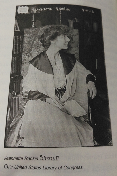 (1890-1973) โลกรู้จัก Jeannette Rankin ในฐานะสมาชิกรัฐสภาคนแรกของสหรัฐฯ ที่สำคัญเธอเป็นผู้หญิงคนเดียวที่ลุกขึ้นต่อต้านการเข้าร่วมสงครามโลกของสหรัฐฯ ทั้ง 2 ครั้ง โดยเฉพาะครั้งที่ 2 เพราะเธอเป็นคนเดียวในสภาที่ยืนขึ้น และออกเสียงไม่เข้าร่วมสงคราม